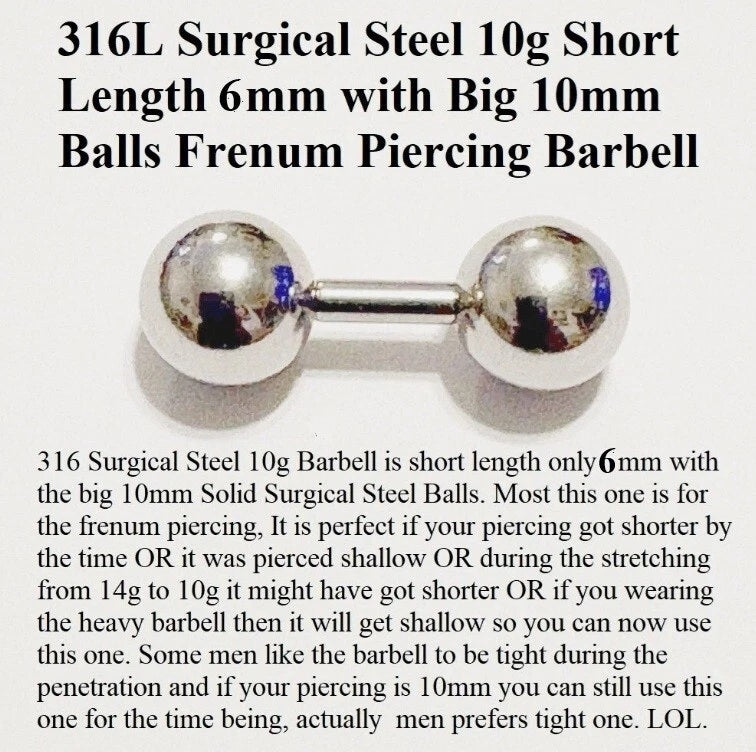 Surgical Steel 10g Short Lengths with 10mm Balls Frenum Barbell or Massager.