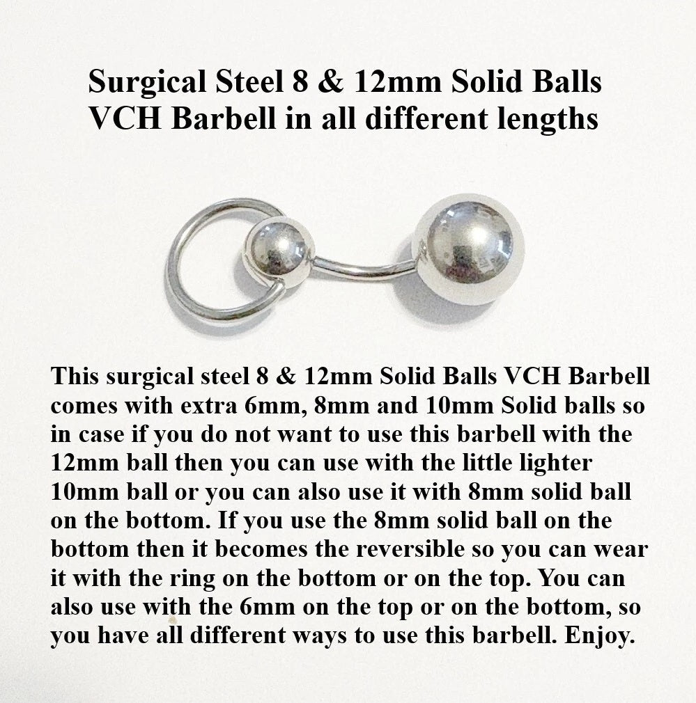 Brand New Sterilized Surgical Steel 14g Surgical Steel with12mm Solid balls VCH Slave Barbell. We do make in shorter lengths but do not recommend if you need to use the shorter lengths please message us at abbyxtc@gmail.com