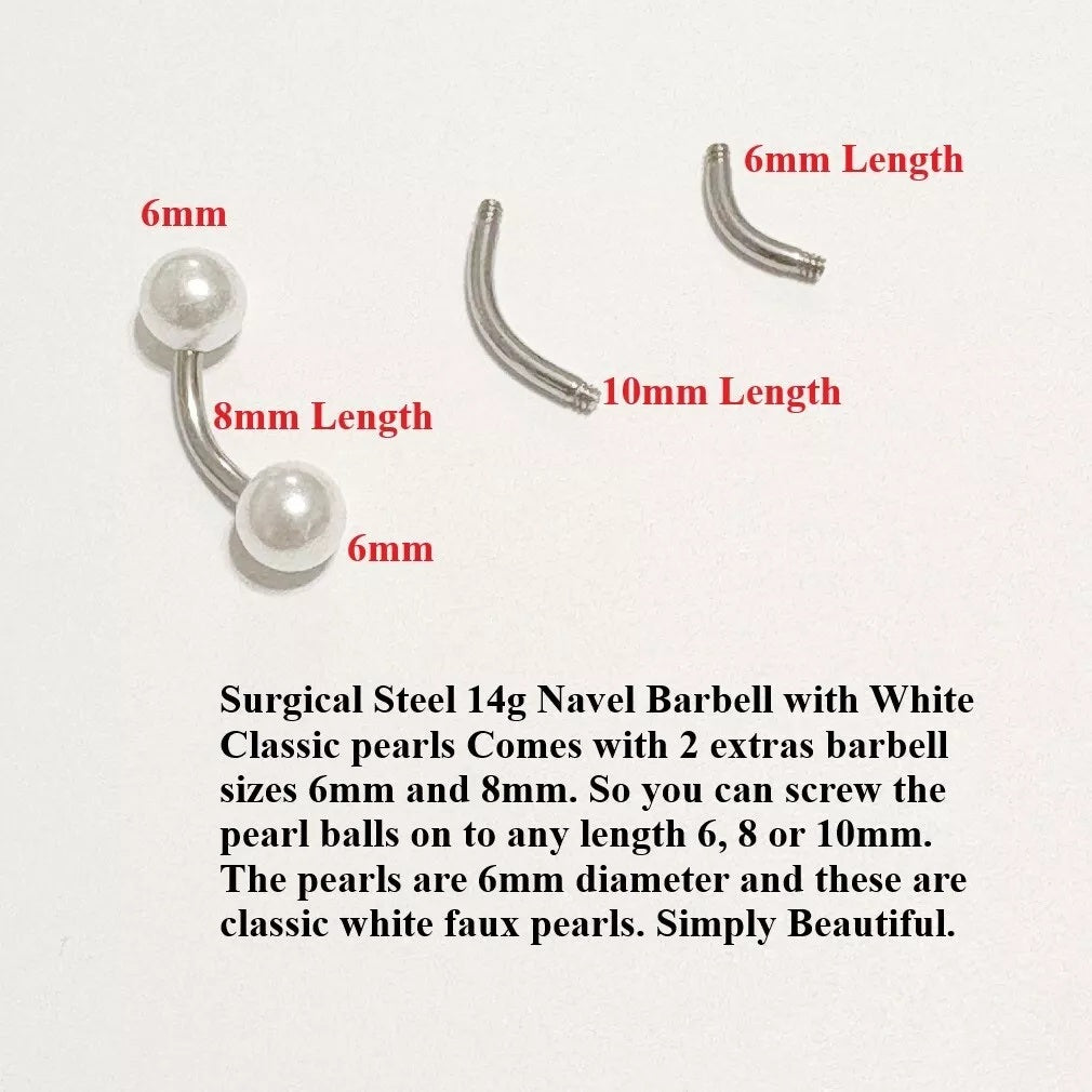 Surgical Steel 14g 6, 8 & 10mm Length White Faux Pearl Navel Barbell.
